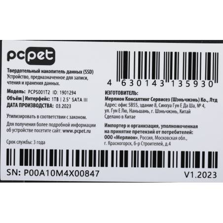 Накопитель SSD PC Pet SATA-III 1TB PCPS001T2 2.5" OEM