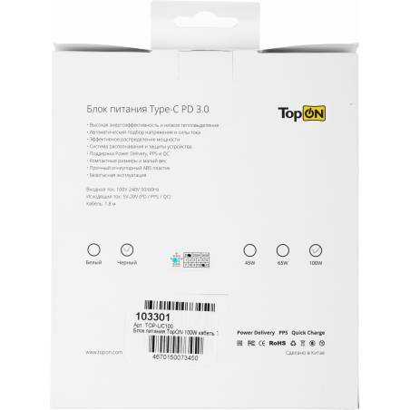 - Универсальный блок питания TopON TOP-UC100 100W c кабелем Type-C, PowerDelivery 3.0 и PPS, в розетку. Автоматический подбор напряжения и силы тока. Стабилизация напряжения и защита от помех. Кабель устойчивый к высоким температурам по стандарту CSA FT1. П