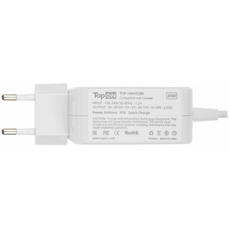 - Блок питания TopON для ноутбука Huawei TOP-HW45QW 45W c кабелем Type-C. Подходит для зарядки ноутбуков Huawei и других устройств через универсальный порт USB-C. Прочный ABS пластик.