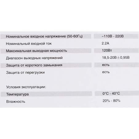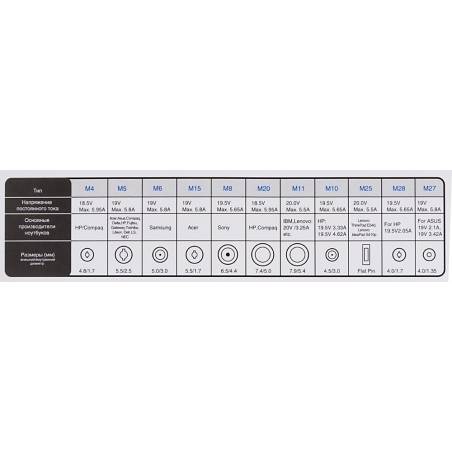 - Универсальный сетевой адаптер для ноутбуков основных производителей. Автоматический выбор выходного напряжения, с помощью подключения необходимого переходника. Защита от перегрузки и перегрева.