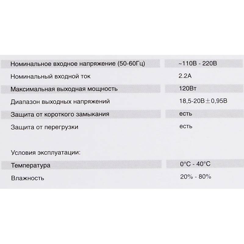 - диаметр: 4.0/1.7 мм, 19.5v, 5.65A