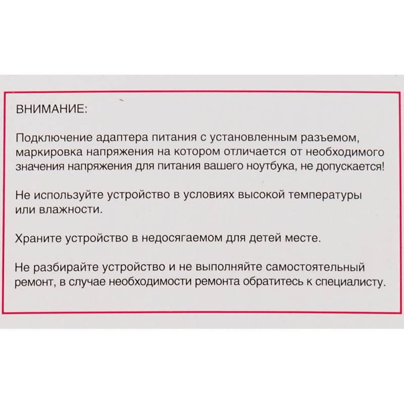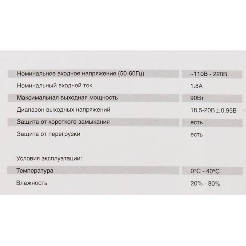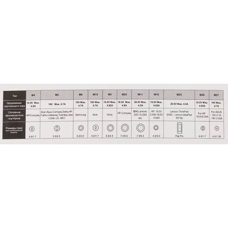 - Устройство представляет собой универсальный импульсный адаптер питания для ноутбуков с максимальной выходной мощностью 120Вт. Выходное напряжение постоянного тока на выходе адаптера питания может принимать одно из следующих значений: 18,5В, 19В, 19,5В