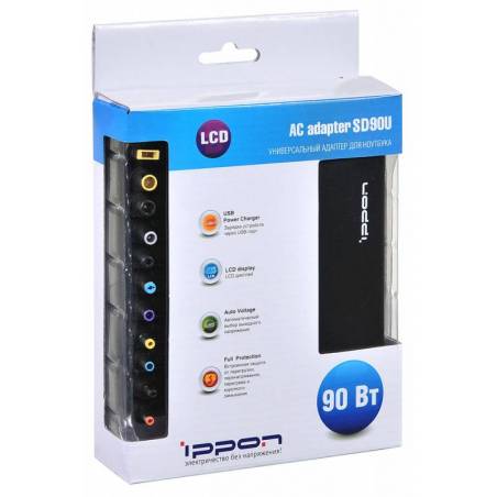 Блок питания Ippon SD90U автоматический 90W 15V-19.5V 11-connectors 4.5A 1xUSB 2.1A от бытовой электросети LСD индикатор