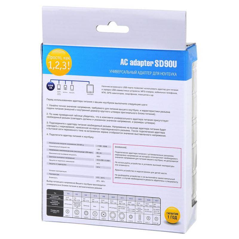 - Универсальный сетевой адаптер для ноутбуков основных производителей со встроенным USB-портом, через который Вы сможете подзаряжать смартфон, планшет, навигатор или MP3-плеер. Автоматический выбор выходного напряжения, с помощью подключения необходимого пе