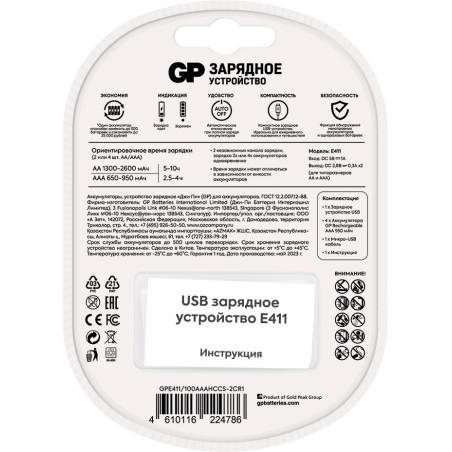 - Компактное и удобное зарядное устройство GP Е411-100AAAHCCS-2CR1на 4 слота обеспечит бесперебойную зарядку аккумуляторов для использования в вашей бытовой и офисной технике, гаджетах, игрушках и пр. Время заряда: АА - 5-10 ч, ААА - 2,5-4 ч.