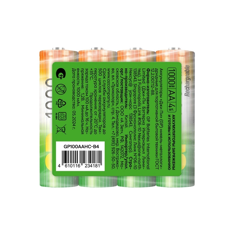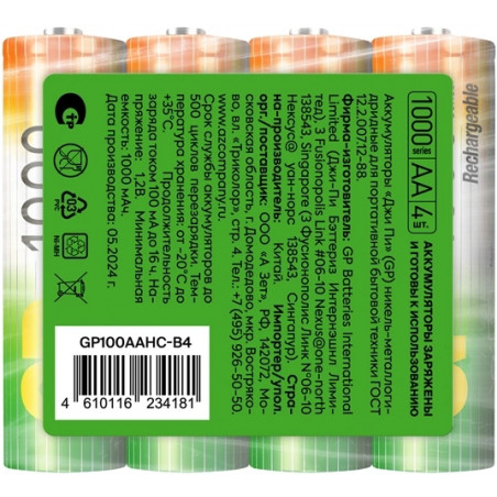 Аккумулятор GP 100AAHC-B4 AA NiMH 1000mAh (4шт) спайка