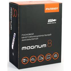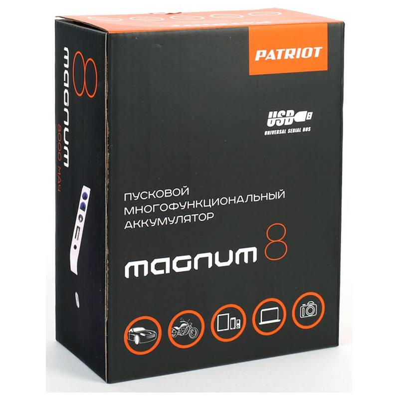 - Пусковой многофункциональный аккумулятор PATRIOT MAGNUM 8 650201608 - отличный выбор для дальних поездок, так как прибор может не только запустить бензиновый двигатель объемом до 3 л в случае необходимости, но и позволит зарядить мобильный телефон, фотоап