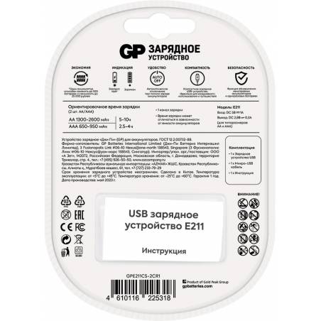 - Компактное зарядное устройство GP E211-100AAAHCCS-2CR1 на 2 слота обеспечит пополнение энергии аккумуляторам. Устройство способно заряжать одновременно 2 элемента питания, 2 типоразмера батареек. Время заряда: АА - 5-10 ч., ААА - 2,5-4 ч.