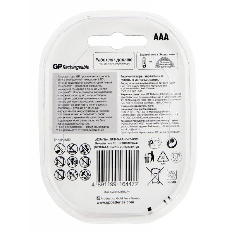 Аккумулятор GP Rechargeable 100AAAHC4/2 AAA NiMH 1000mAh (6шт) блистер
