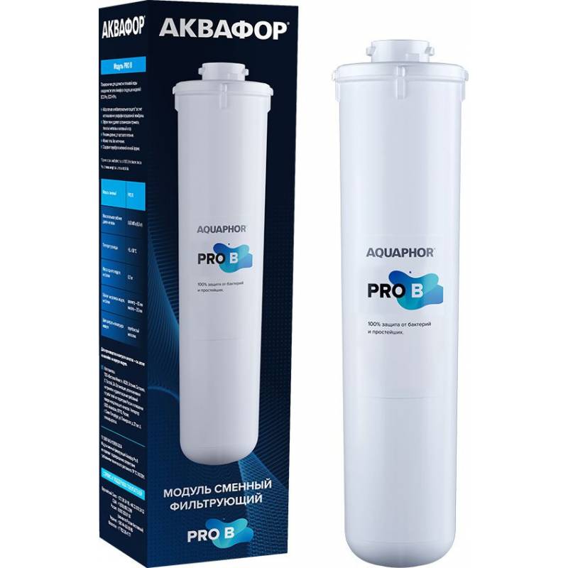 - Модуль Pro B с ультрафильтрационной мембраной обеспечивает механическое удаление бактерий и цист без применения химических бактерицидов. Поры мембраны в 5 раз меньше любого микроорганизма, поэтому вода не требует кипячения и безопасна для всех членов семь