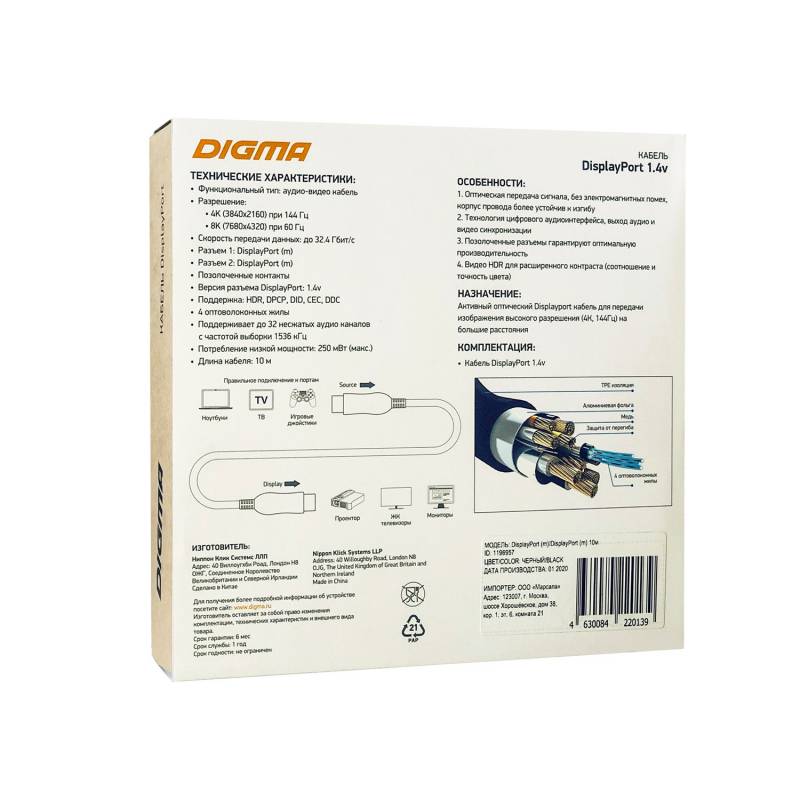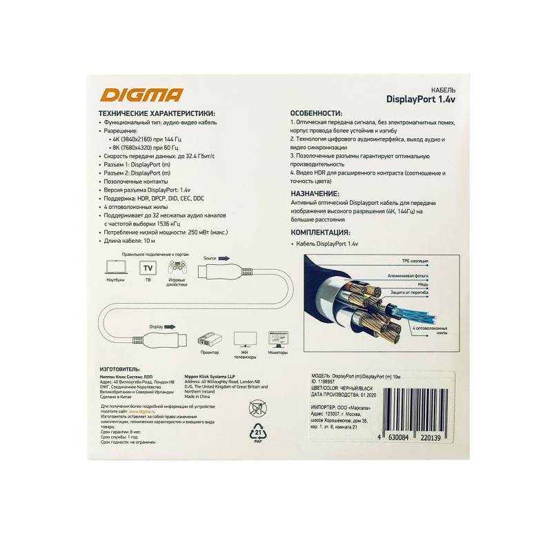 Кабель аудио-видео Digma 1.4v AOC DisplayPort (m)/DisplayPort (m) 10м. позолоч.конт. черный (BHP DP 1.4-10)