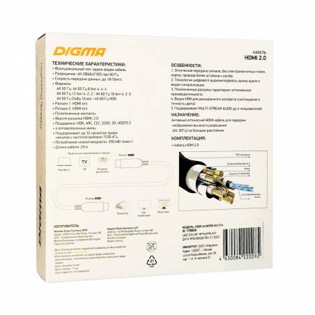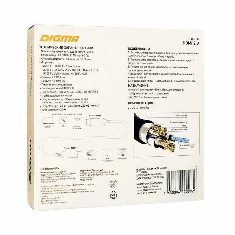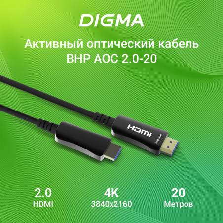 Кабель аудио-видео Digma HDMI 2.0 AOC HDMI (m)/HDMI (m) 20м. позолоч.конт. черный (BHP AOC 2.0-20)