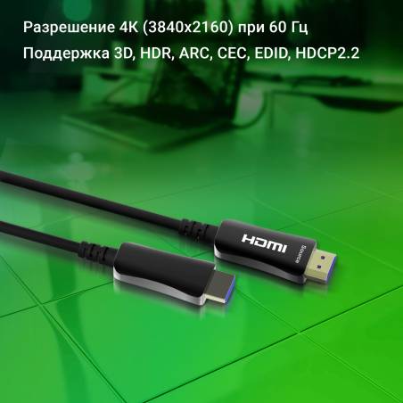 - Активный оптический HDMI кабель для передачи изображения высокого разрешения (4К, 60Гц) на большие расстояния