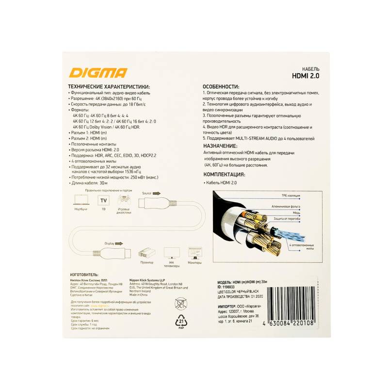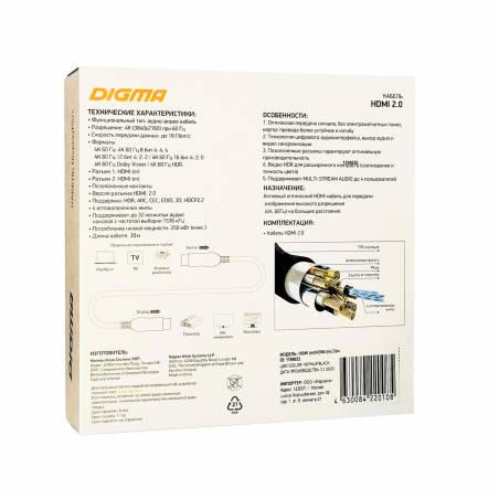 Кабель аудио-видео Digma HDMI 2.0 AOC HDMI (m)/HDMI (m) 30м. позолоч.конт. черный (BHP AOC 2.0-30)