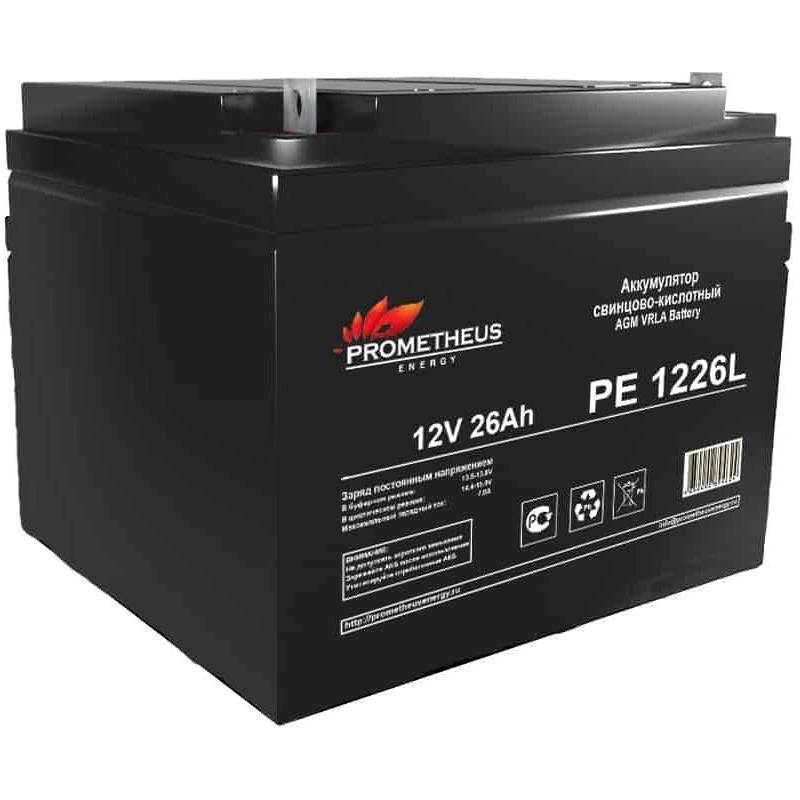 - Prometheus Energy свинцово-кислотный аккумулятор PE 1226L создан по технологии AGM, с абсорбированным электролитом и увеличенным сроком службы. Предлагаемый аккумулятор является не обслуживаемым. Он герметизирован, а образующийся газ рекомбинируется. Доли