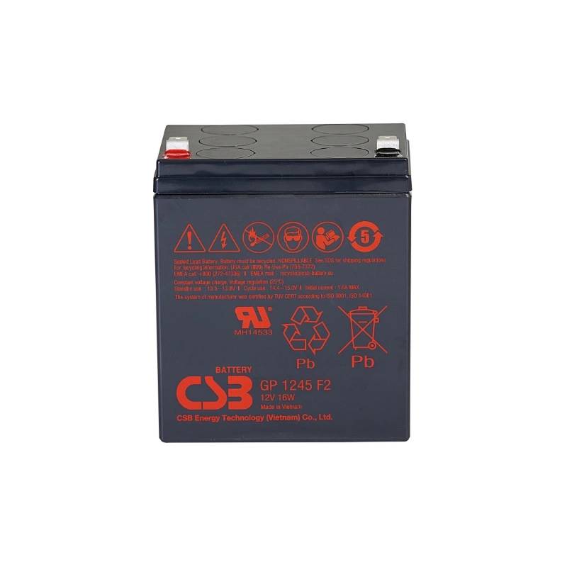 - Аккумулятор CSB GP 1245 F2 (16 W) общего применения со сроком службы 5 лет в буферном режиме или более 260 циклов заряда-разряда в циклическом режиме при 100% разряде. Как и все батареи CSB, она перезаряжаемая, высокоэффективная и не требующая обслуживани