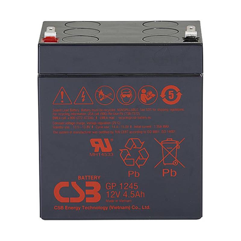 - Аккумулятор CSB GP 1245 общего применения со сроком службы 5 лет в буферном режиме или более 260 циклов заряда-разряда в циклическом режиме при 100% разряде.