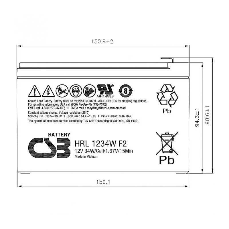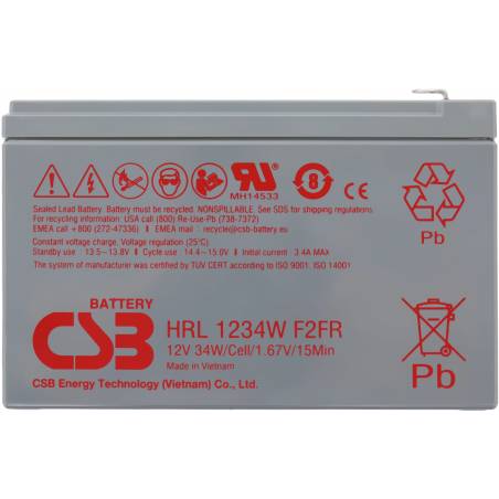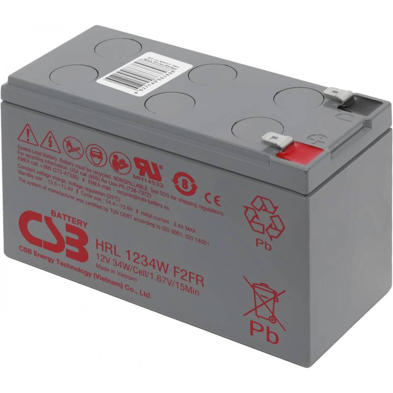 - Аккумулятор CSB HRL 1234W F2 FR с высокой энергоемкостью. Особенная кристаллическая решетка электродов позволила увеличить на 20% отдаваемую мощность по сравнению с батареями других серий. Она разработана для эксплуатации в режиме высоких токов разряда пр