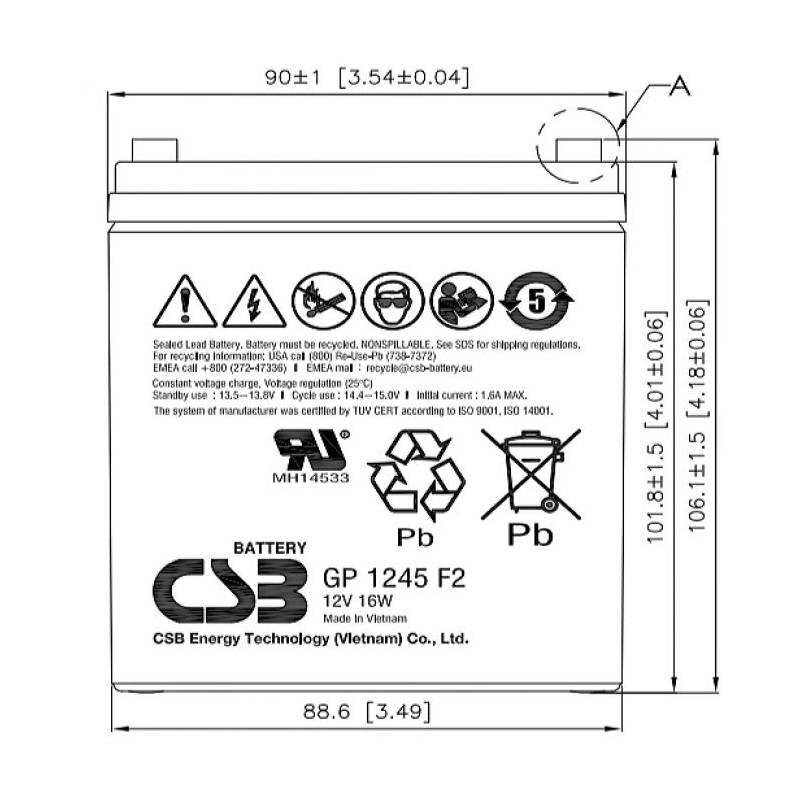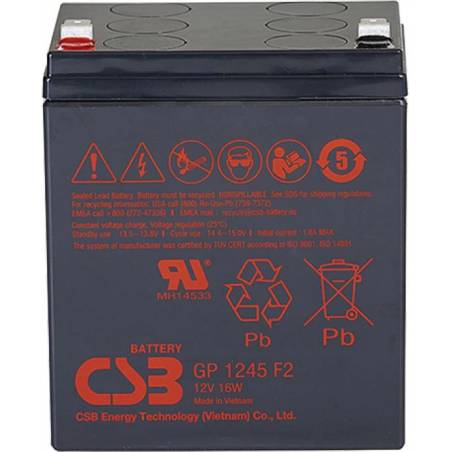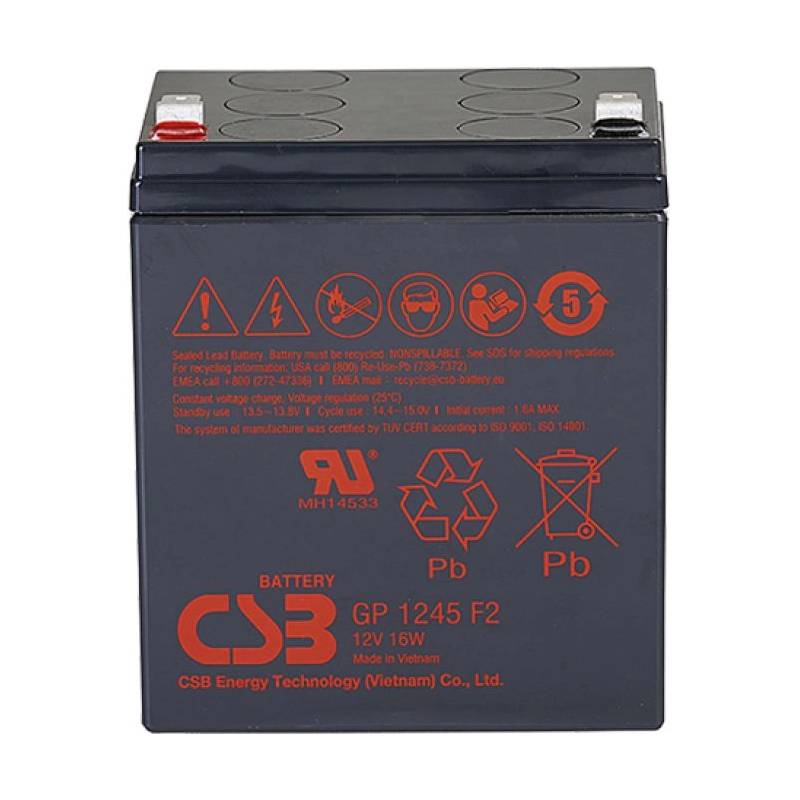 - Аккумулятор CSB GP 1245 F2 (16 W) общего применения со сроком службы 5 лет в буферном режиме или более 260 циклов заряда-разряда в циклическом режиме при 100% разряде. Как и все батареи CSB, она перезаряжаемая, высокоэффективная и не требующая обслуживани