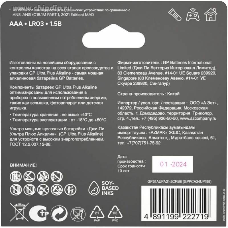 Батарея GP Ultra Plus Alkaline 24AUPA21-2CRB8 AAA (8шт) блистер