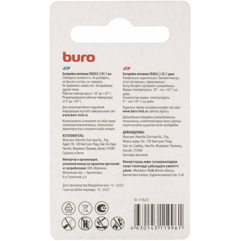 Батарея Buro Lithium CR2032 (1шт) блистер