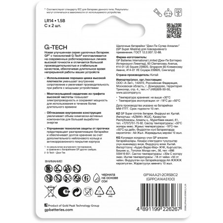 Батарея GP Super G-Tech Alkaline 14A LR14 C (2шт) блистер