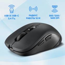 Мышь Оклик 610MWC черный оптическая 1600dpi беспров. USB/USB-C для ноутбука 6but (1158012)