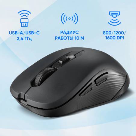 - Удобная мышь. 6 кнопок. Возможность подключения по Type C. В комплекте два адаптера USB-приемник Type A и USB-приемник Type С, покрытие soft touch, боковая ребристая поверхность. Специальное ПО расширяющее функциональные возможности мышки.