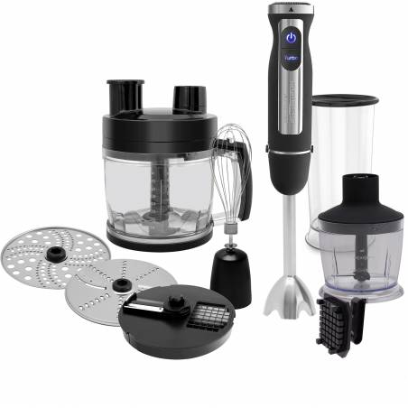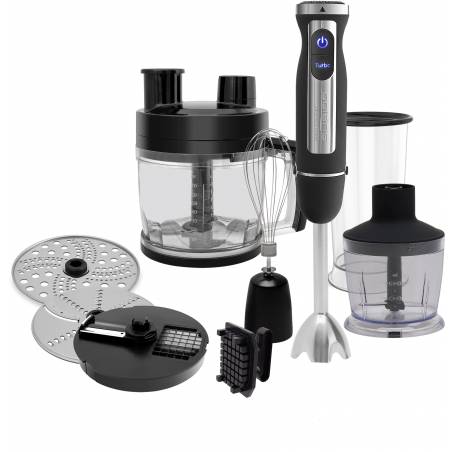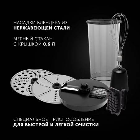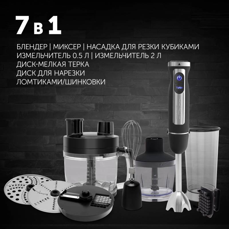 - 7 в 1: блендер, миксер, насадка для резки кубиками, измельчитель 0.5 л, измельчитель 2л, мерный стакан 0,5л, диск-мелкая терка, диск для нарезки ломтиками/шинковки