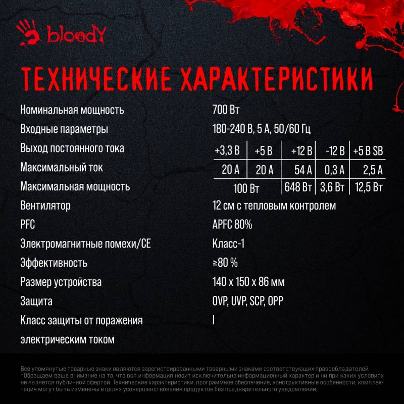 Блок питания Bloody ATX 700W BD-PS700W 80 PLUS WHITE (20+4pin) APFC 120mm fan 6xSATA RTL