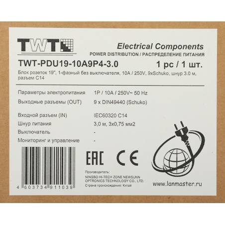 Блок распределения питания Lanmaster TWT-PDU19-10A9P4-3.0 гор.размещ. 9xSchuko базовые 10A C14 3м