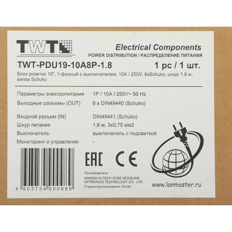 Блок распределения питания Lanmaster TWT-PDU19-10A8P-1.8 гор.размещ. 8xSchuko базовые 10A Schuko 1.8м