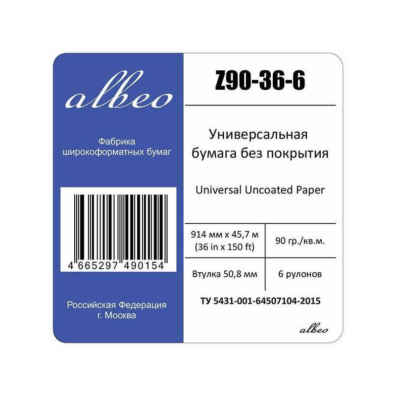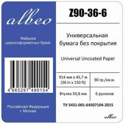 Бумага Albeo Z90-36-6 36"(A0) 914мм-45.7м/90г/м2/белый для струйной печати втулка:50.8мм (2")