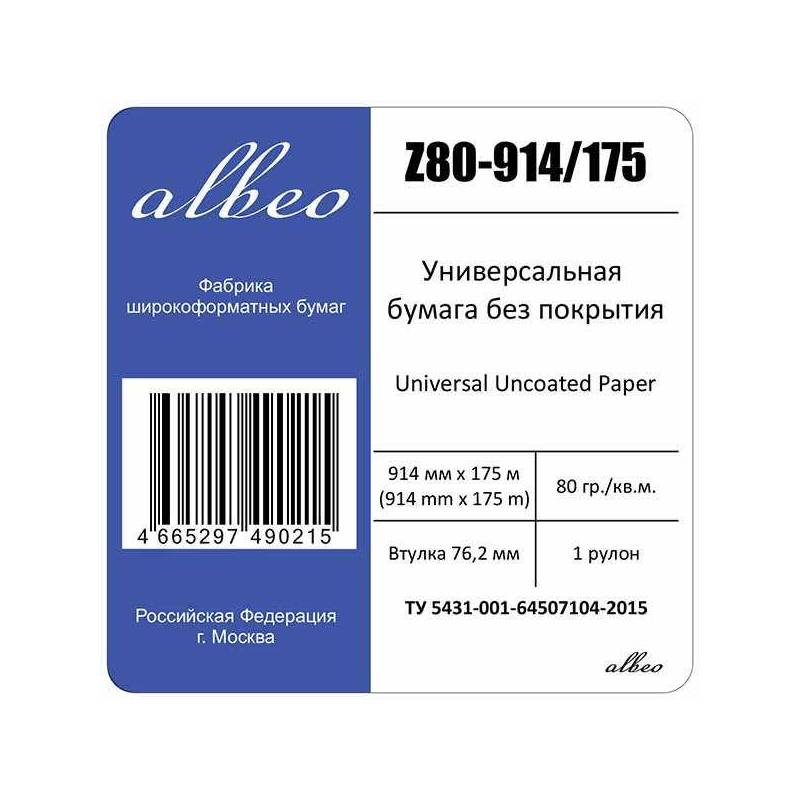 Бумага Albeo Z80-914/175 36"(A0) 914мм-175м/80г/м2/белый для струйной печати втулка:76.2мм (3")