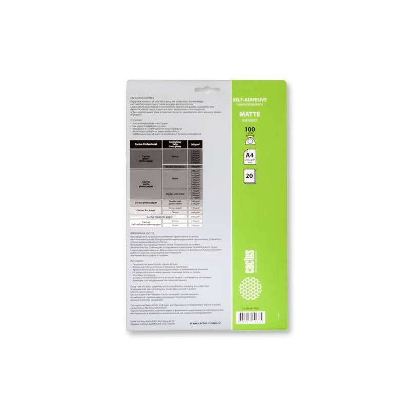 Фотобумага Cactus CS-MSA410020 A4/100г/м2/20л./белый матовое самоклей. для струйной печати
