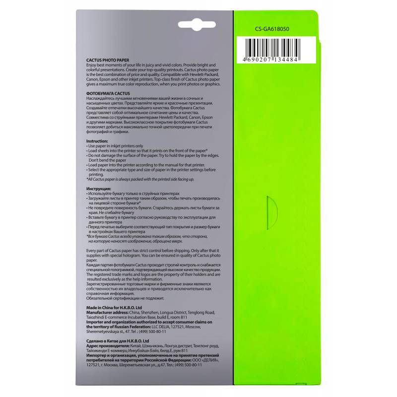 Фотобумага Cactus CS-GA618050 10x15/180г/м2/50л./белый глянцевое для струйной печати