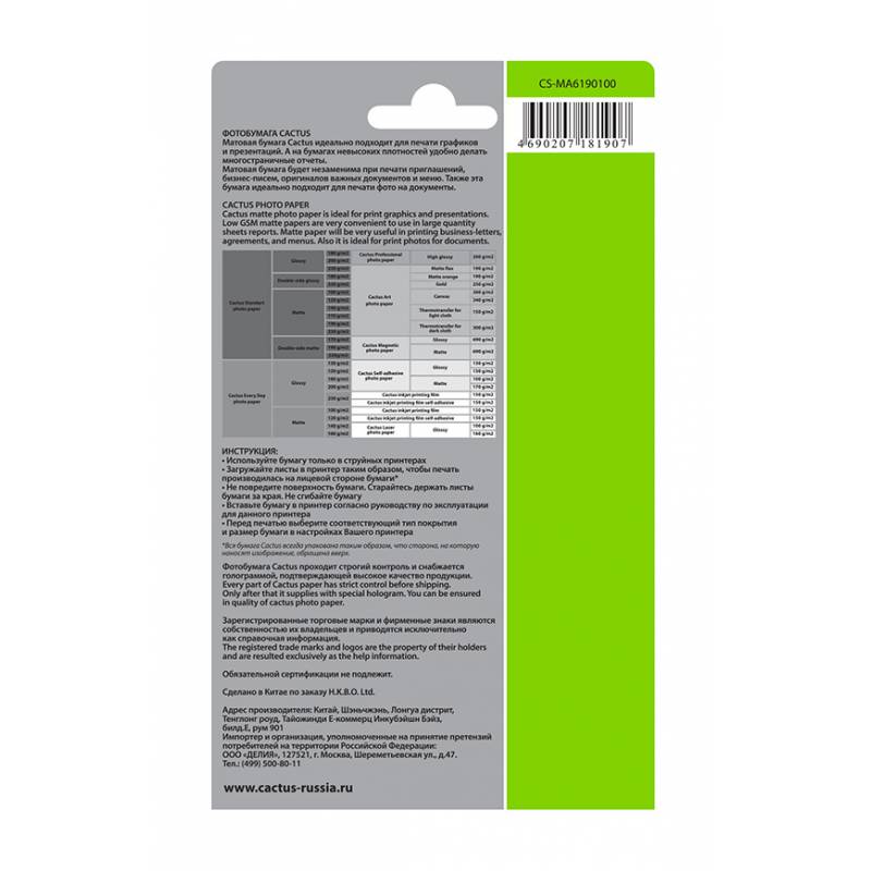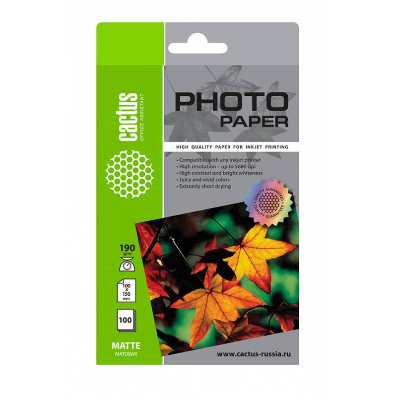 Фотобумага Cactus CS-MA6190100 10x15/190г/м2/белый/100л. матовое для струйной печати