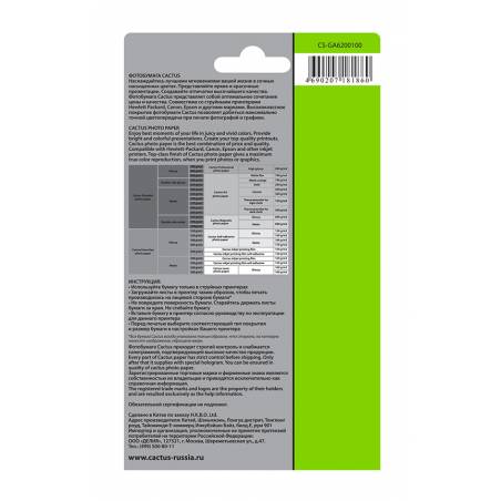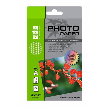Фотобумага Cactus CS-GA6200100 10x15/200г/м2/белый/100л. глянцевое для струйной печати