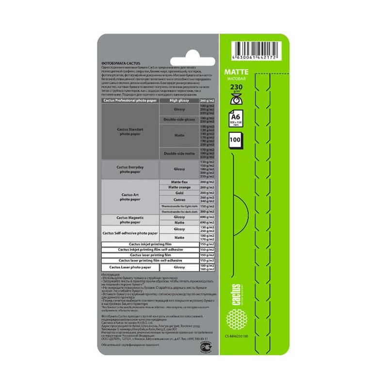 Фотобумага Cactus CS-MA6230100 10x15/230г/м2/белый/100л. матовое для струйной печати