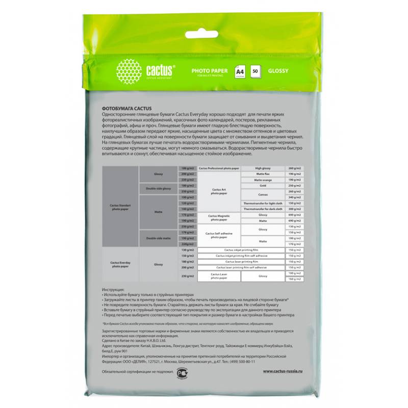Фотобумага Cactus CS-GA415050ED A4/150г/м2/50л./белый глянцевое для струйной печати