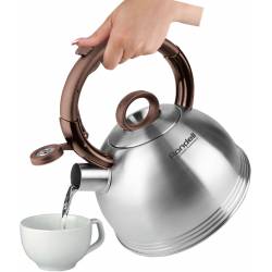 - Изысканная сатинированная полировка корпуса. Аксессуары: из бакелита с покрытием Soft Touch. Преимущества: возможность налива воды одной рукой. Бакелитовый свисток со стальной сердцевиной и устройством для открывания носика на ручке. Упаковка: