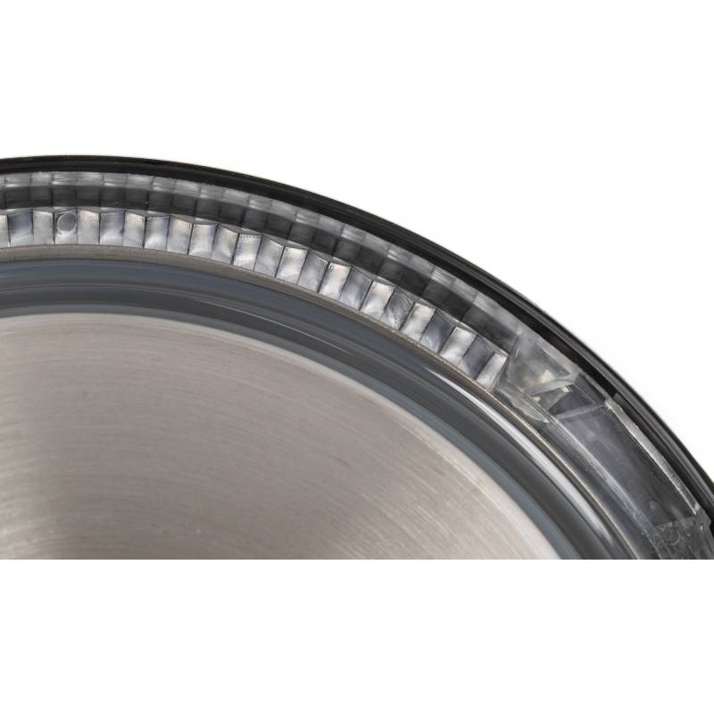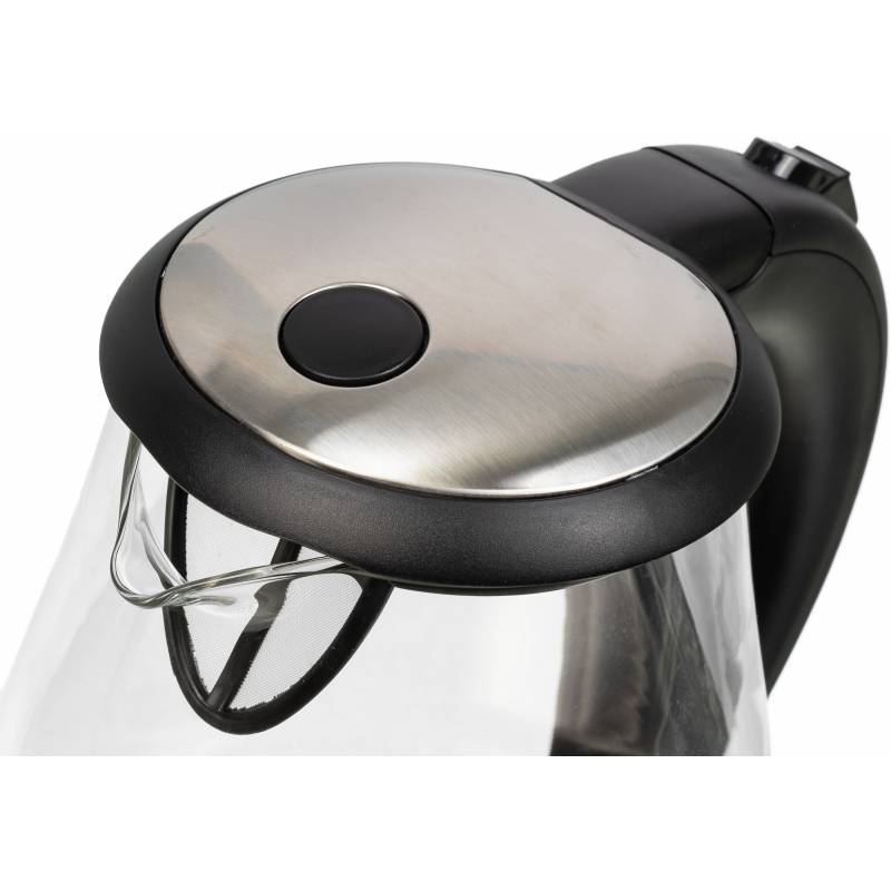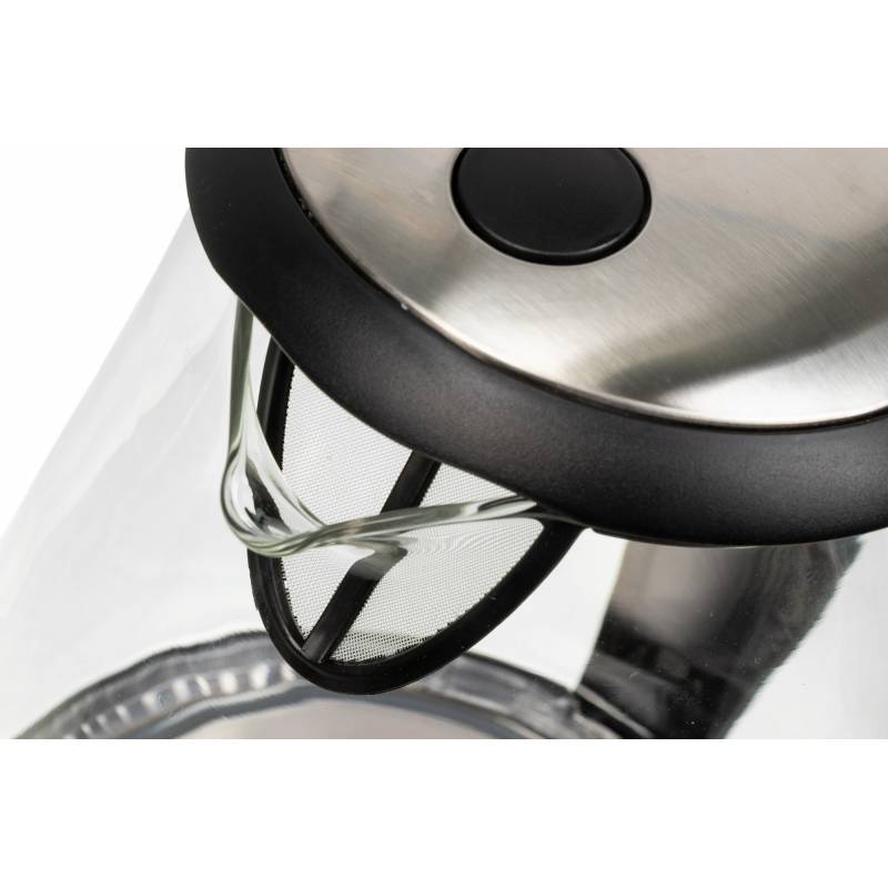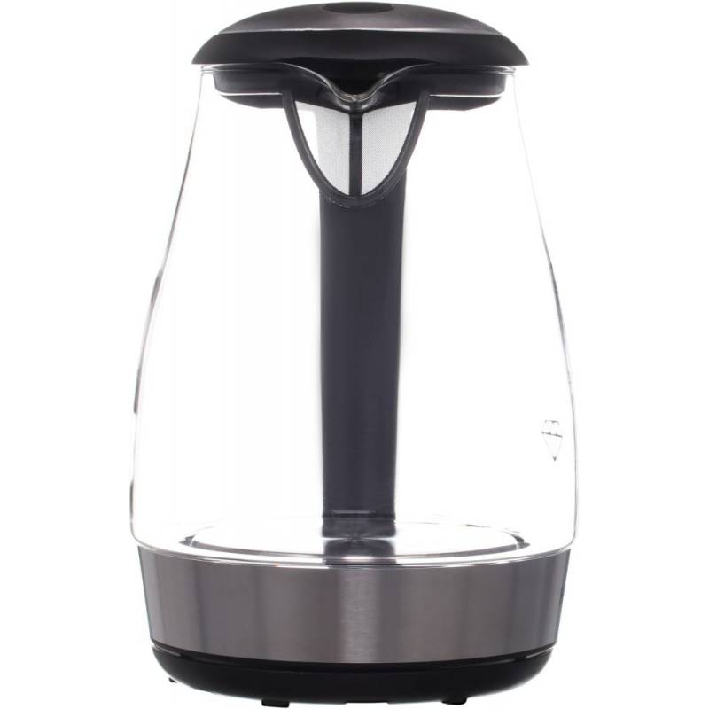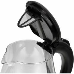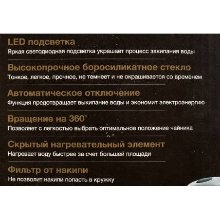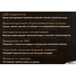 - В чайнике используется высококачественное боросиликатное стекло, легкое, прочное, не темнеет и не окрашивается со временем. Красивая голубая LED подсветка украшает процесс закипания и оповещает о включении прибора. 2 года гарантии.