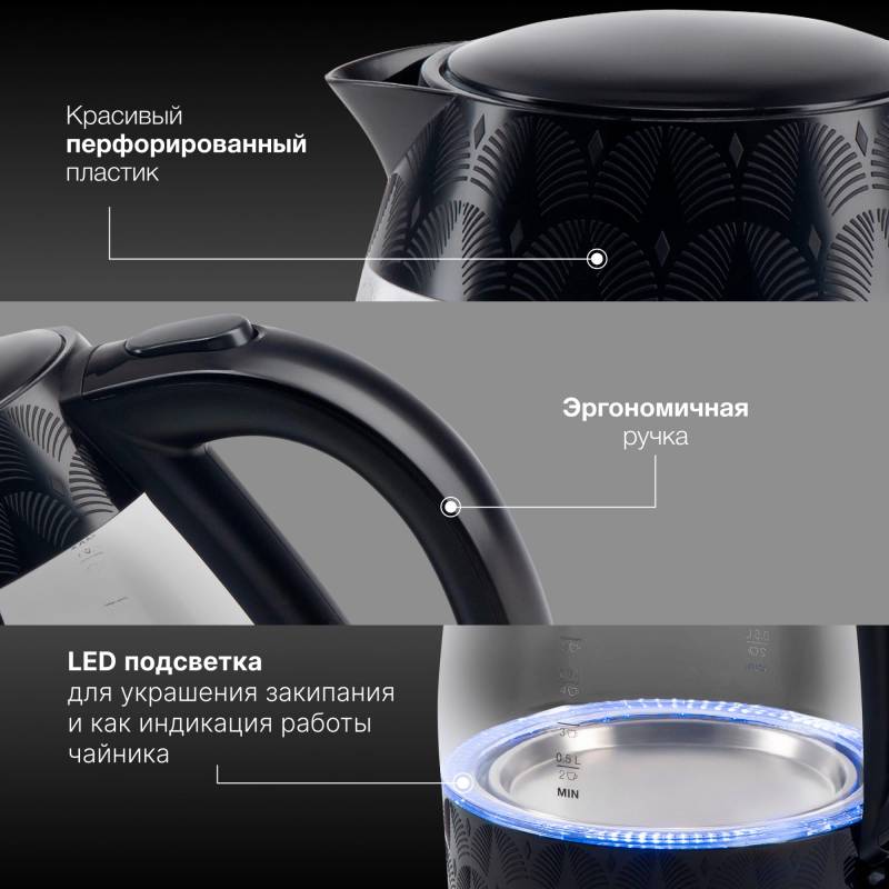- кнопка открытия крышки, подсветка воды, подставка 360, фильтр от накипи