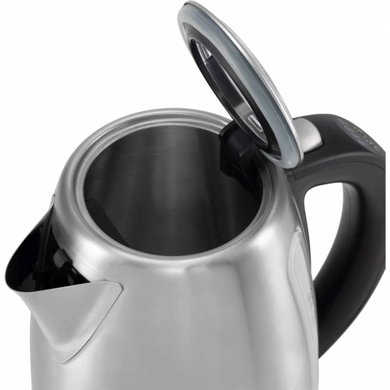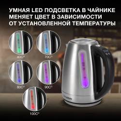 - Стильный металлически чайник, с регулировкой температуры на ручке, красивой голубой подсветкой и не обычной формы шкалой уровня воды, фильтром от накипи и прозрачной крышкой , станет незаменимым помощником на вашей кухне.