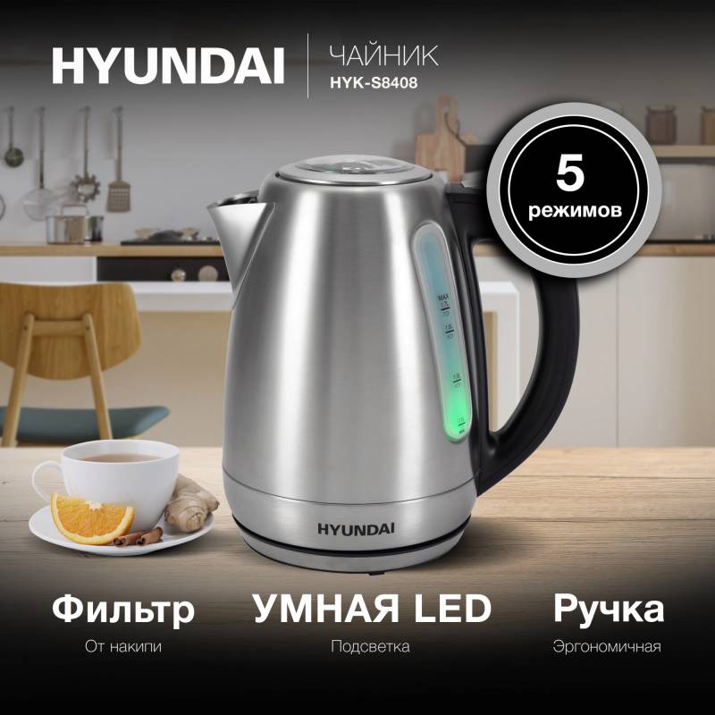 Чайник электрический Hyundai HYK-S8408 1.7л. 2200Вт серебристый матовый/черный корпус: металл