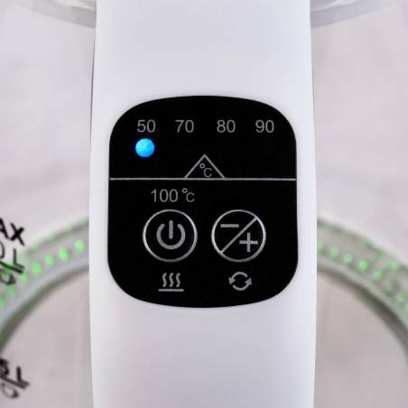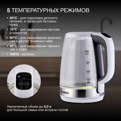 - Чайник имеет 5 настраиваемых температурных режима для разных сортов чая, кофе, настоек и компотов, приготовления детского питания и других бытовых нужд, + функция поддержания температуры. Температурные режимы: 50,70,80,90,100 + функция поддержания те
