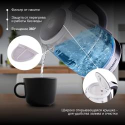 - Чайник увеличенного объема, с регулировкой температуры на ручке, красивой голубой подсветкой, фильтром от накипи и эргономичной ручкой , станет незаменимым помощником на вашей кухне.