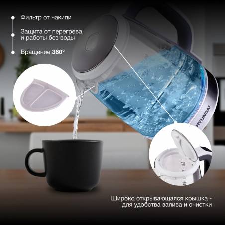 - кнопка открытия крышки, подсветка воды, подставка 360, фильтр от накипи
