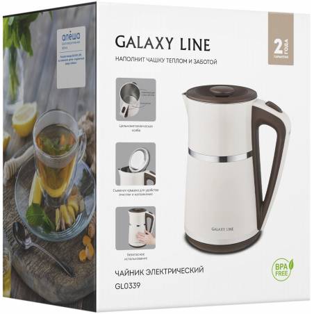 - Чайник электрический GALAXY LINE GL0339 имеет лаконичный современный дизайн и впишется в интерьер любой кухни. Чайник имеет двойные стенки из нержавеющей стали марки 18/10 и пищевого пластика.