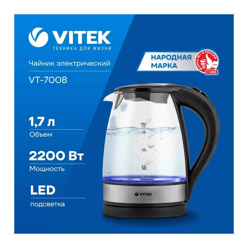 Чайник электрический Vitek VT-7008 1.7л. 2200Вт прозрачный корпус: стекло/пластик